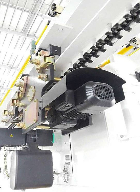 我公司生產(chǎn)的盾構(gòu)掘進管片吊機由以下三部分組成:鋼結(jié)構(gòu)部分、運行機構(gòu)部分、電氣控制部分。1、鋼結(jié)構(gòu)部分:有單軌式和雙軌式兩種形式,軌道采用國標(biāo)優(yōu)質(zhì)工字鋼制作。2、運行機構(gòu)包括起升機構(gòu)和行走小車兩部分組成。起升機構(gòu)使用我公司生產(chǎn)的環(huán)鏈電動葫蘆,該產(chǎn)品具有體積小、工作級別高(M5)、起重量有2t、3.2t、5t、6.3t四種規(guī)格。行走小車驅(qū)動有鏈條傳動、齒條傳動和膠輪驅(qū)動。行走小車爬坡能力強(爬坡坡度可達10度)。3、電氣控制部分,分有線遙控器控制和無線遙控器控制。兩種方式都能控制軌道梁上的起吊設(shè)備(環(huán)鏈電動葫蘆)的上、下運動和小車行走方向前、后運動。為了操作使用的安全性,防止操作人員的誤操作而產(chǎn)生故障。在電氣控制上對有線遙控操作和無線遙控操作具有互鎖功能。